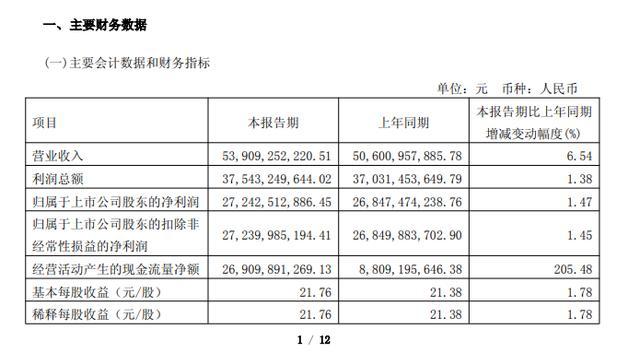 4月24日,贵州茅台(600519.SH)公告称,2026年第一季度实现营业收入539.09亿元,同比增长6.54%;归属于上市公司股东的净利润为272.43亿元,同比增长1.47%。
